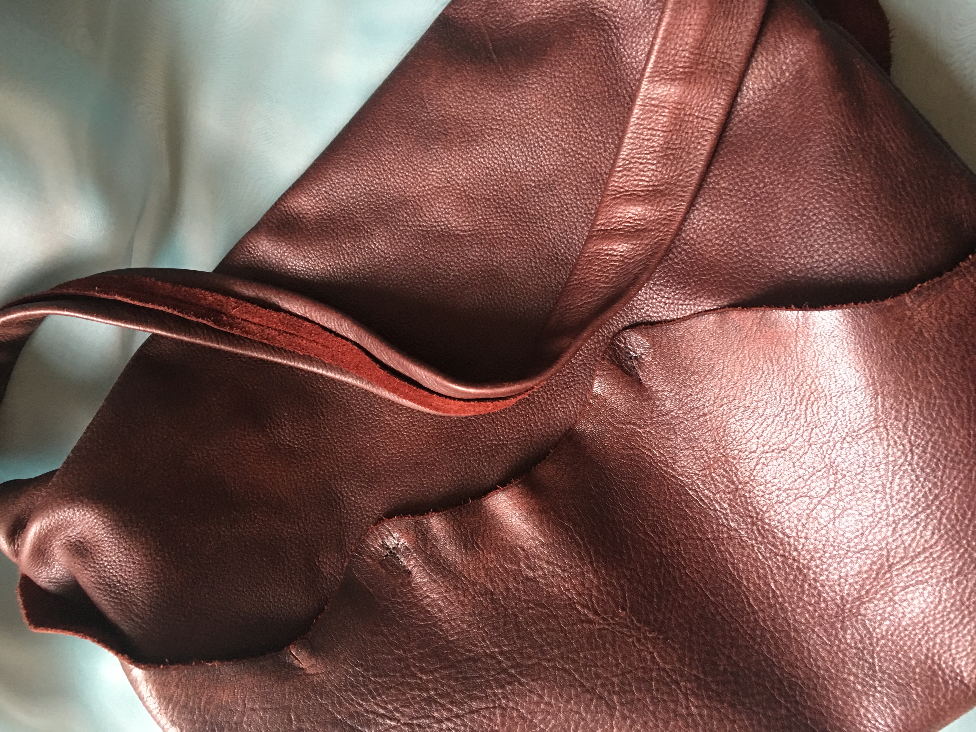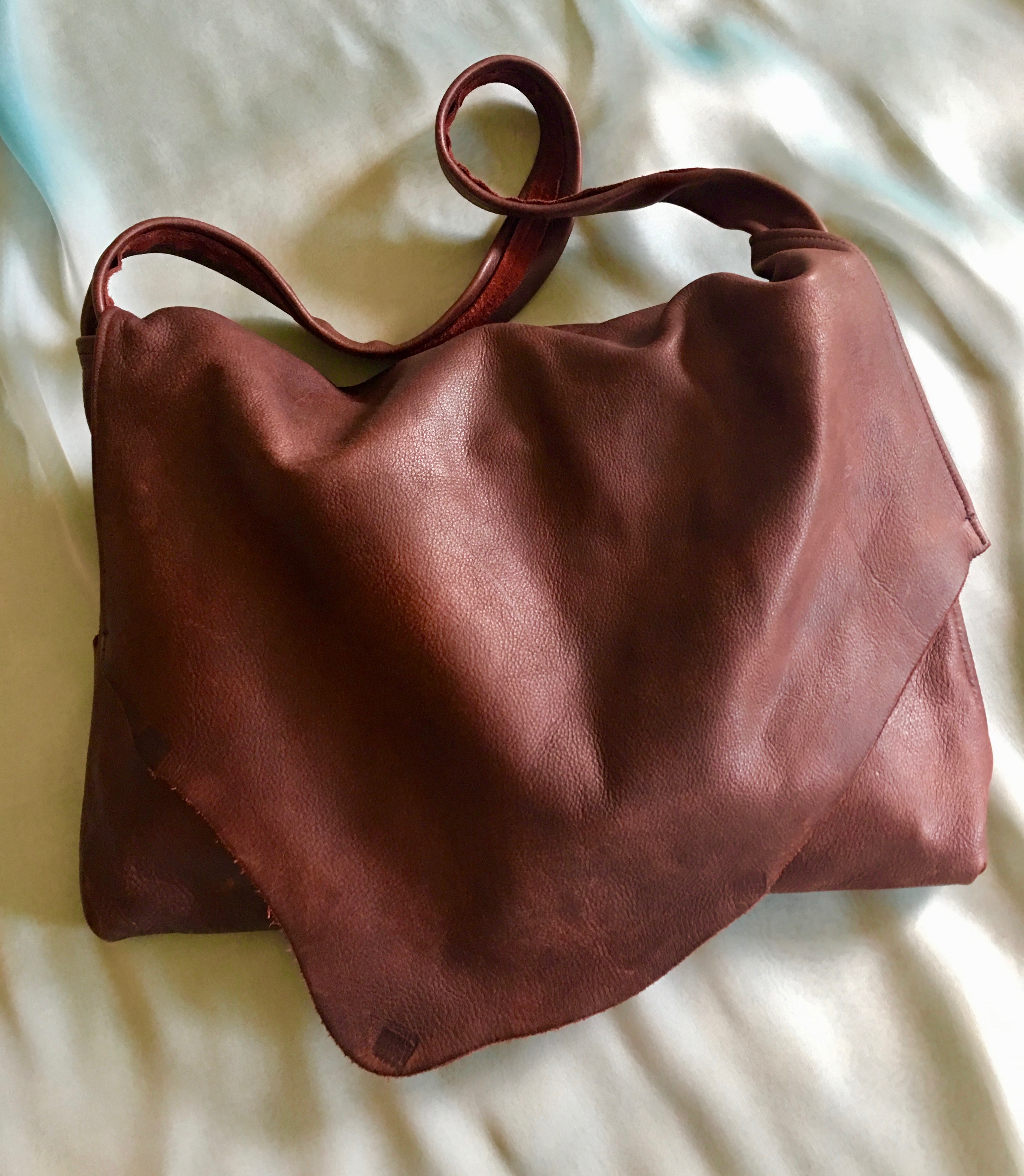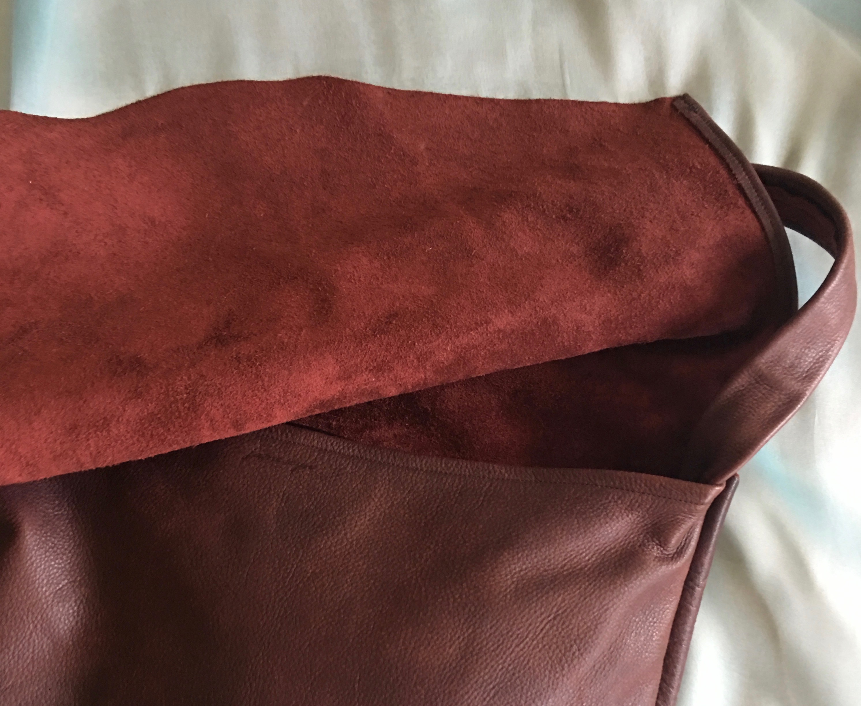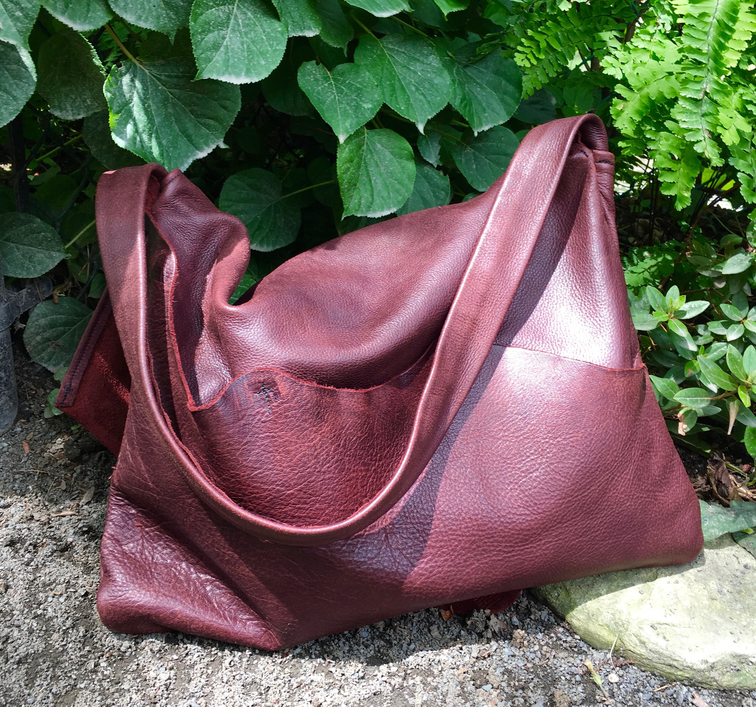 Slouchy, comfortable, rugged…burgundy leather shoulder bag, unlined, red suede interior. Pocket on the back the full width of the bag. Large enough for a laptop. Don’t mess with Texas!
