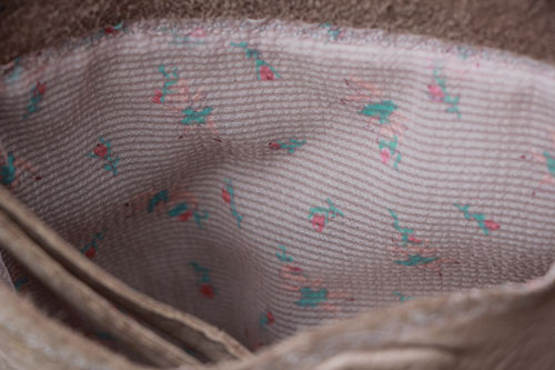 Soft and funky lavender leather, lined with vintage pink nylon seersucker adorned with the sweetest little fairies! Wish I had this in London in 1968! Very unusual imprints on this leather and decorative machine stitching.